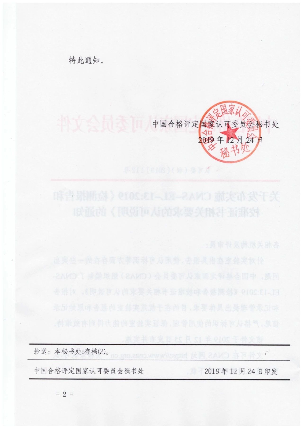 關于發布實施CNAS-EL-13:2019《檢測報告和校準證書相關要求的認可說明》的通知